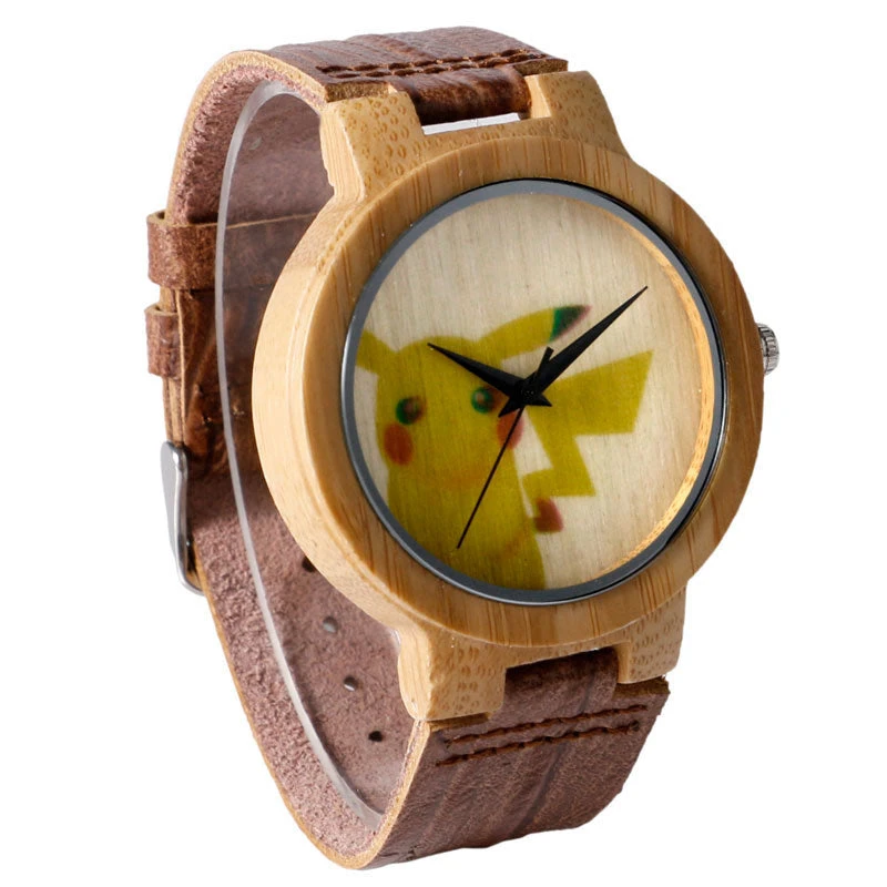 Eine etwas andere Armbanduhr ist diese aus Bambus / Holz gefertigte Quarz Uhr mit Pokemon Pikachu Motiv. Das komplette Gehäuse ist aus Holz gefertigt lediglich das Ziffernblatt ist mit einem Schutz aus Plastik versehen. Eine tolle Uhr für alle Umweltbewußten Pokemon Freunde.