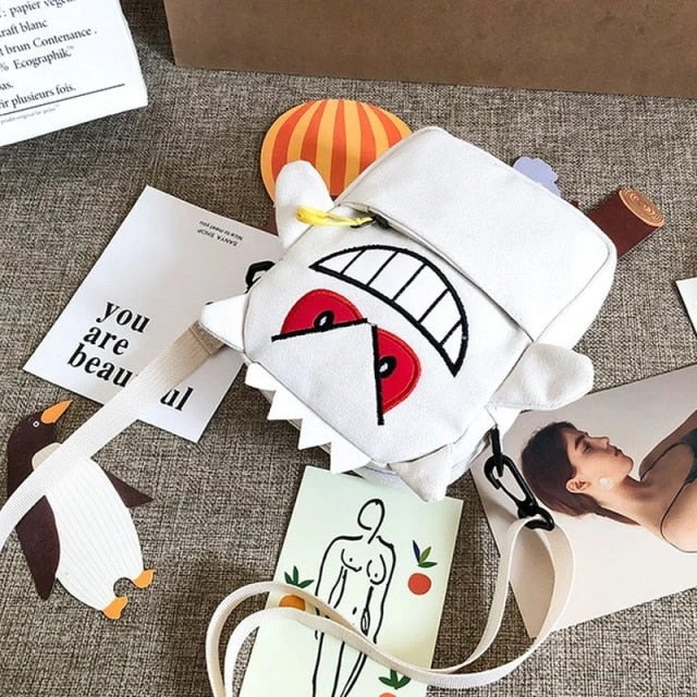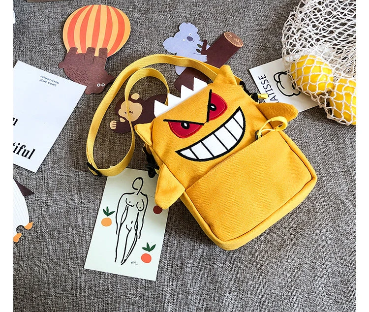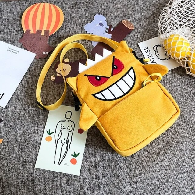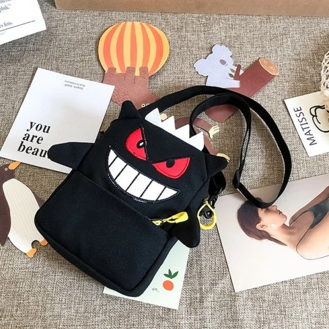 Diese Umhängetasche ist gerade für Fans der Pokémon Serie was Besonderes. Denn diese hat das Design des Geist- und Gift- Pokémon Gengar. Gengar ist die Nachfolgestufe von Apollo und die Vorstufe von Nebulak. Das Markenzeichen von Gengar ist sein breites Grinsen, sowie die roten Augen. Auf dem Kopf hat es spitze, stachelige Haare. Genau dieses Aussehen ist auf der Umhängetasche sehr gut nachgebildet.